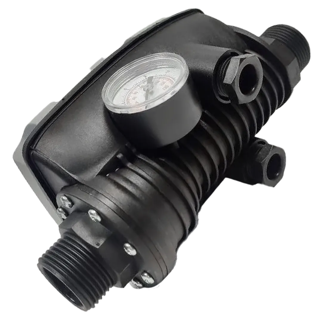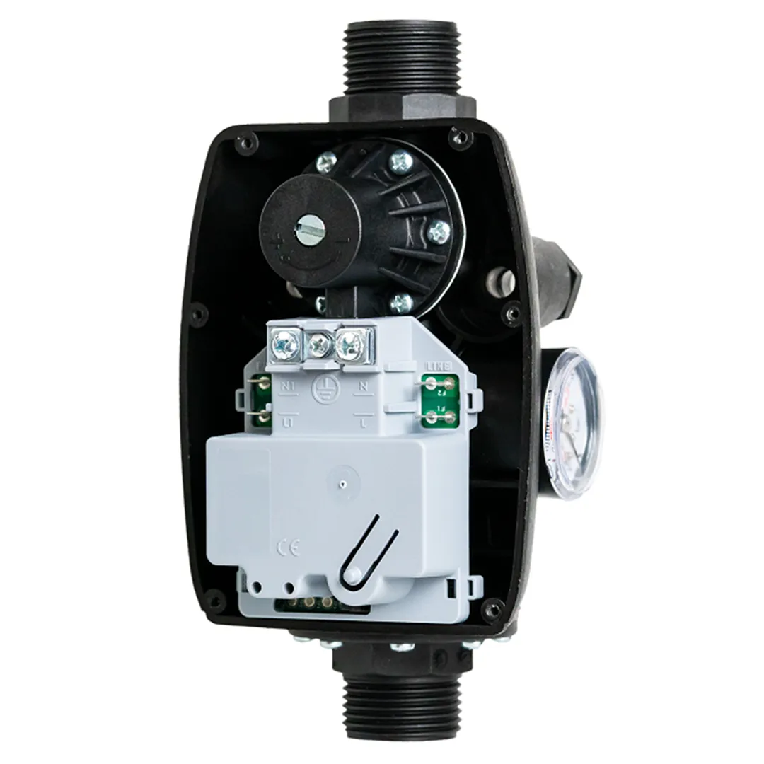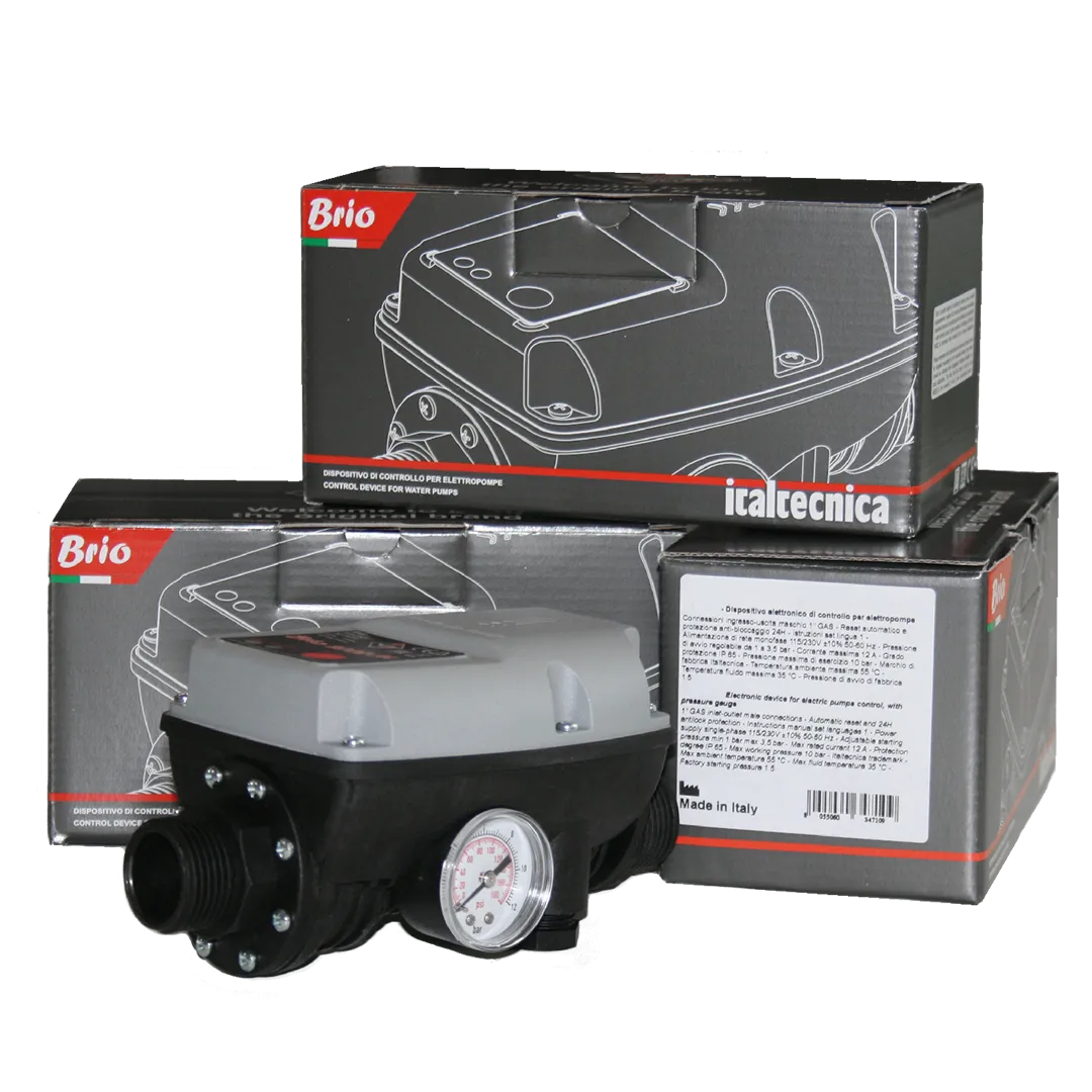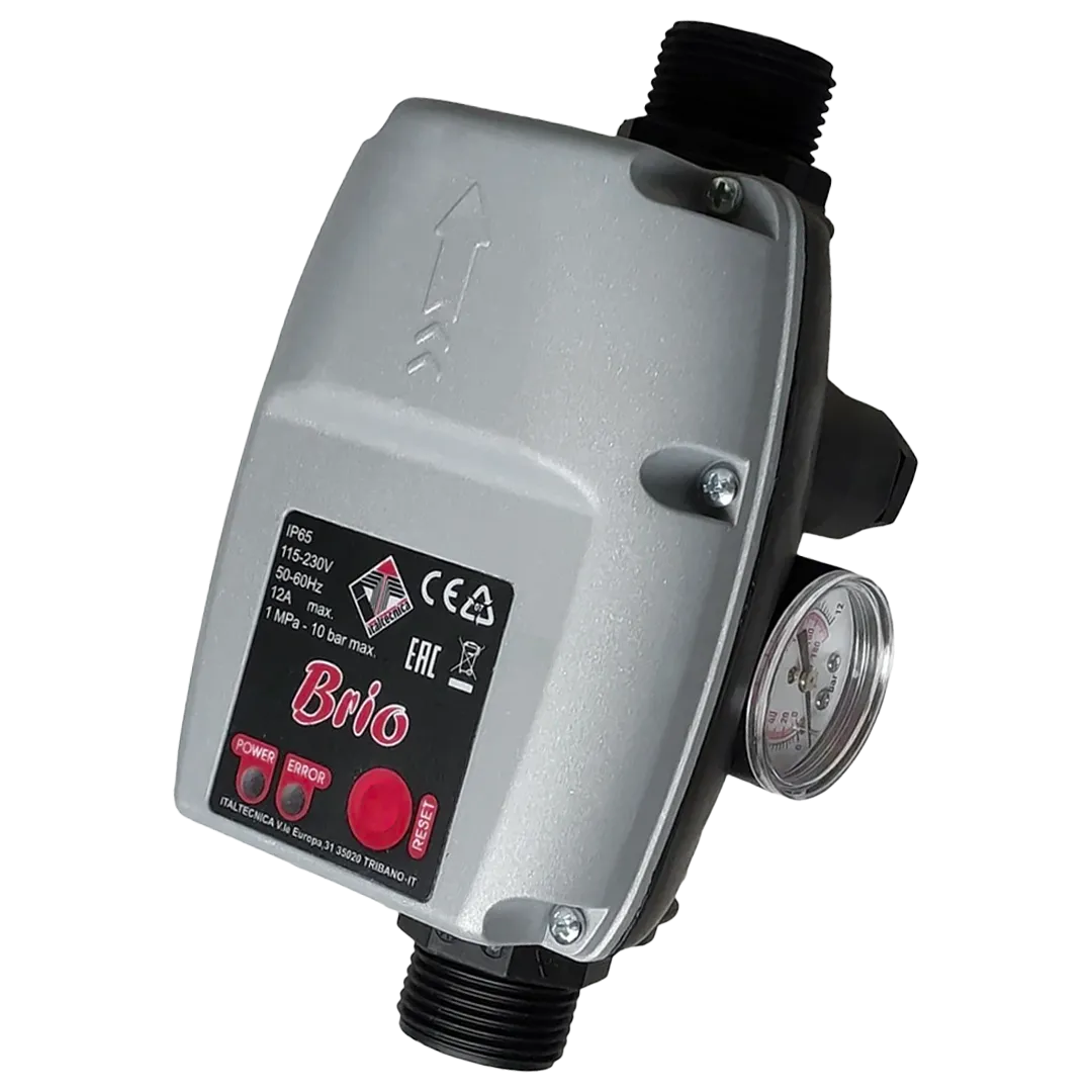 Реле давления Italtecnica BRIO2000 применяется для автоматического включения и выключения однофазных электронасосов мощностью до 2 л.с. Полностью заменяет традиционно используемые автоматические станции водоснабжения, состоящие из реле давления и гидроаккумулятора. Включает электронасос после падения давления в системе (открытые краны) и выключает его, когда прерывается поток воды при максимальном значении давления для электрического насоса (краны закрыты). Кнопка RESET (сброс) 2. Индикатор остановки (сухой ход) 3. Индикатор напряжения сети 4. Клеммы подключения насоса 5. Винт для регулировки давления срабатывания 6. Вход с резьбовым соединением 1" резьба="" наружная="" предзаказу="" внутренняя="" вращающая="" Подключения="null" питания="" Выход="null" с="" резьбовым="" соединением="" Манометр="null" в="" версии="">