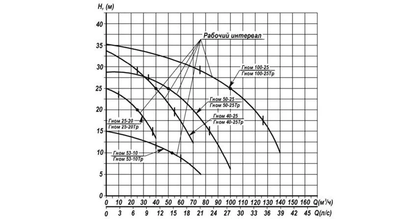 Графические характеристики дренажного насоса ГНОМ 50-25