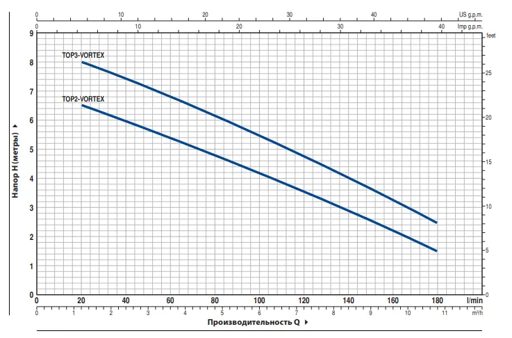 Графические характеристики дренажного насоса PEDROLLO TOP 2 VORTEX