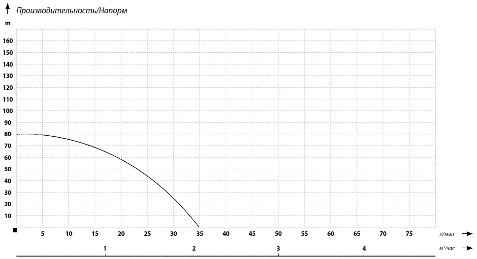 Высокая производительность: Мощность 750 Вт и максимальный напор до 80 м позволяют эффективно поднимать воду на значительные глубины и обеспечивать достаточный расход воды для ваших потребностей.