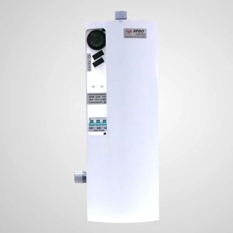 Электрический котел ЭРДО ЭВПМ-NEXT-12ВП предназначен для водяного отопления зданий, имеющих открытую или закрытую отопительную систему, работающую при давлении не более 0,2 МПа (20 м водяного столба) при напряжении трёхфазной сети 380В или однофазной сети 220В. Электрокотлы могут использоваться в качестве основного или резервного источника теплоснабжения. Они не нуждаются в постоянном обслуживании, экологически безвредны и безопасны. Электроводонагреватель состоит из корпуса, стальной ёмкости, пульта управления, закрепленного внутри корпуса. В верхней части ёмкости, во фланце, смонтированы трубчатые электронагреватели. Элeктрoкoтёл имеет встроенный пульт управления, предназначенный для переключения мощности и регулирования температуры нагрева теплоносителя. Регулятором температуры элeктрoкoтла служит капиллярный термостат, термочувствительный элемент которого закреплён в средней части стальной ёмкости (резервуара). В котле имеется колодка для подключения циркуляционного насоса. Его включение (если он подключен к водонагревателю) производится клавишей, расположенной на лицевой панели электрокотла. Для защиты от перегрева электроводонагреватель оборудован самовозвратным датчиком аварийного отключения (температура срабатывания 90†5 оС). Верхний напорный и нижний обратный патрубки предназначены для присоединения водонагревателя к системе отопления. В ЭВПМ-NEXT реализована возможность изменения расположения патрубков подачи и обратки относительно лицевой панели при монтаже. На лицевой стороне водонагревателя расположена ручка регулятора температуры и клавиши переключения мощности. На нижней части корпуса имеется заглушка ступенчатая для ввода в пульт питающего кабеля. Болт для крепления заземляющего провода расположен внутри корпуса на кронштейне крепления колбы котла