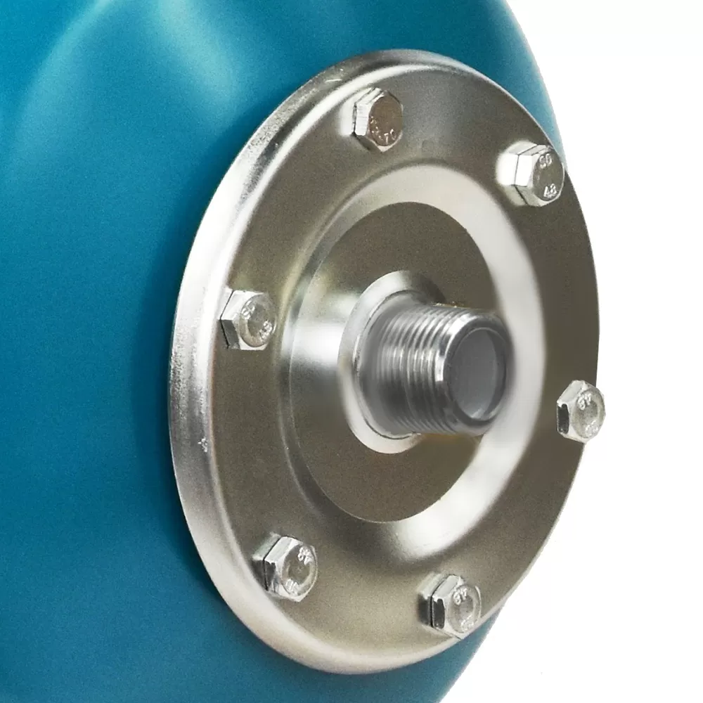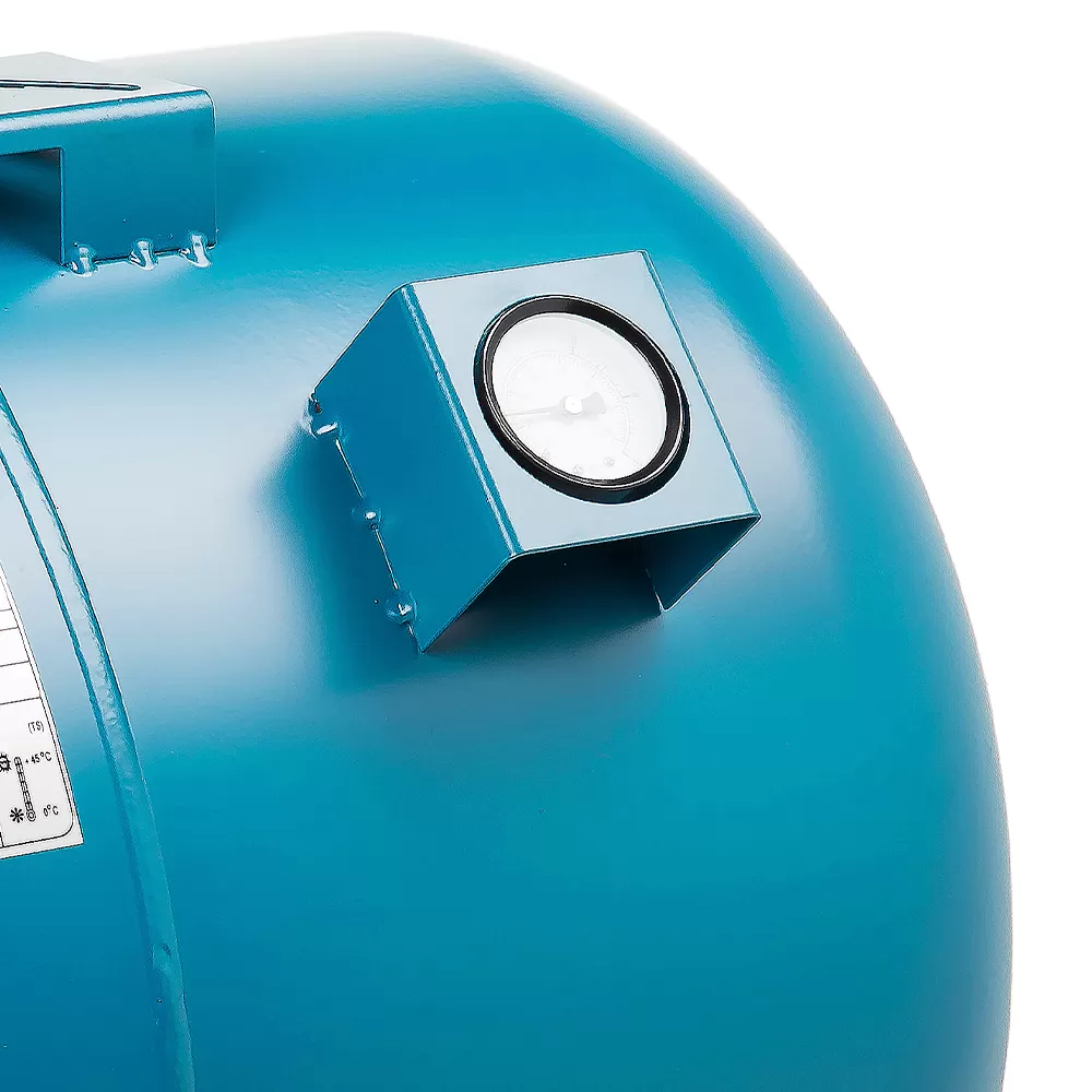 Горизонтальный мембранный бак для воды IBO объемом 50 литров c манометром. Бак выполнен из стали и покрыт специальным антикоррозионным составом. Мембрана бака выполнена из пищевой резины на основе бутилкаучука. Бак снабжен приварной площадкой для установки поверхностного насоса. В нижней части бака установлены металлические кронштейны с целью крепления бака к поверхности.
