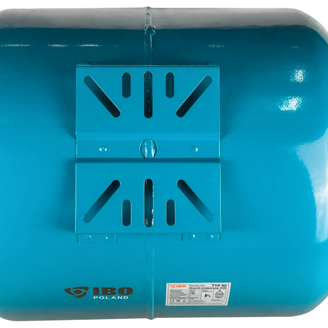 Горизонтальный мембранный бак для воды IBO объемом 80 литров. Бак выполнен из стали и покрыт специальным антикоррозионным составом. Мембрана бака выполнена из пищевой резины на основе бутилкаучука. Бак снабжен приварной площадкой для установки поверхностного насоса. В нижней части бака установлены металлические кронштейны с целью крепления бака к поверхности.