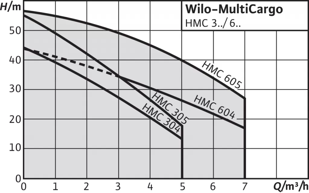 Насосная станция WILO HMC 304 EM - установка с центробежным насосом в компактном исполнении с горизонтальным всасывающим и вертикальным напорным патрубком, которая состоит из следующих компонентов: самовсасывающий многоступенчатый горизонтальный высоконапорный центробежный насос с низким уровнем шума со сквозным насосным валом электродвигателя и не зависящим от направления вращения скользящим торцовым уплотнением. Напрямую присоединенный фланцами однофазный или трехфазный электродвигатель со встроенным термическим защитным выключателем и конденсатором в исполнении для однофазного тока. Система управления насосом с управляющим агрегатом и мембранным напорным баком емкостью 50 л, манометрическим выключателем и манометром (0–6 бар).