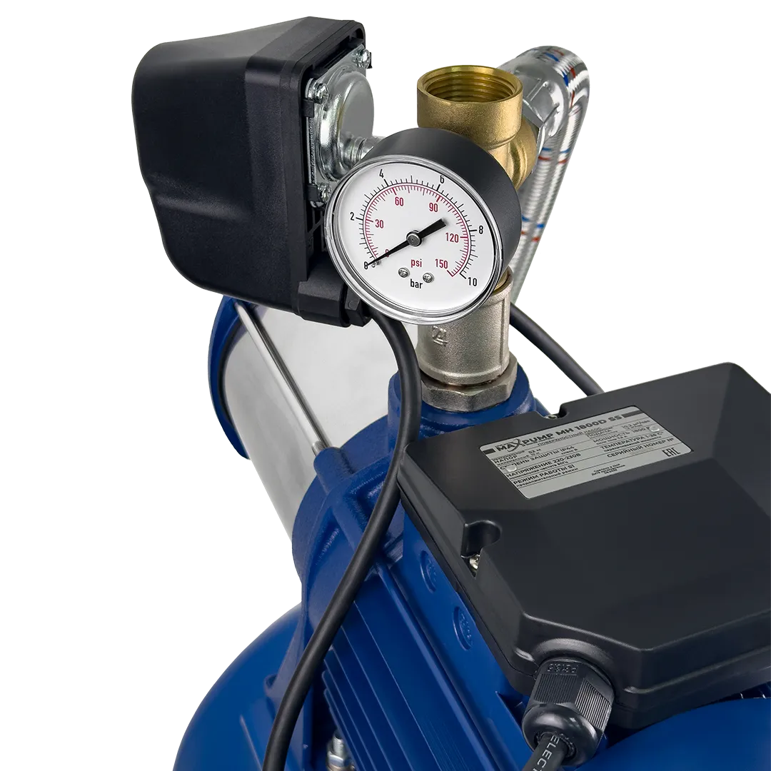 Комплект (Поверхностный насос MAXPUMP MH 2200D SS рабочие колеса из нержавеющей стали, Горизонтальный бак MAXPUMP 24л, Реле давления Italtecnica РМ/5 G14, Пятипозиционный латунный штуцер MAXPUMP, манометр особопрочный MAXPUMP B32-3/T D 63 мм 1/4" аксиальный, Подводка гибкая Italtecnica FAF1060MFC 1" 60 см, Ниппель 1 1/4"х 1", Муфта 1" )