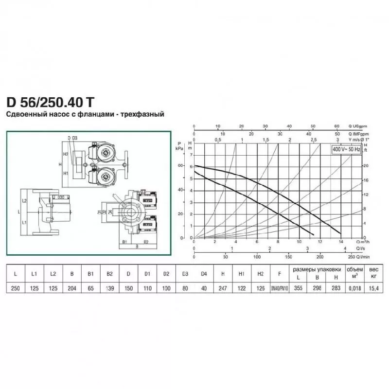 Циркуляционный насос DAB D 56/250.40 T - 400 v предназначен для эксплуатации в системах отопления, где предъявляются повышенные требования к надежности. Отличительной чертой серии D является наличие второго дублирующего насоса, который автоматически включается в работу при поломке первого насоса. Таким образом в одном корпусе расположены сразу два отдельных насоса которые полностью дублируют друг друга. Присоединение насоса с помощью фланцев.