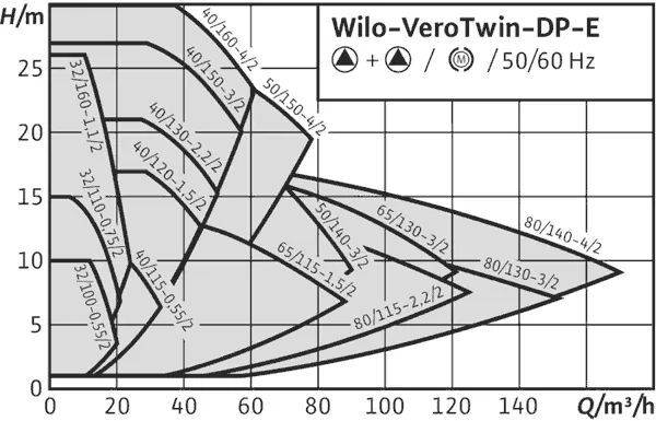 Сдвоенный циркуляционный насос WILO DP-E 80/115-2 с сухим ротором линейного типа для установки в трубах или на фундаменте со встроенным частотным преобразователем для электронного регулирования параметров, в том числе постоянного или переменного перепада давления (Δp-c/Δp-v). Трехфазный электродвигатель с частотным преобразователем